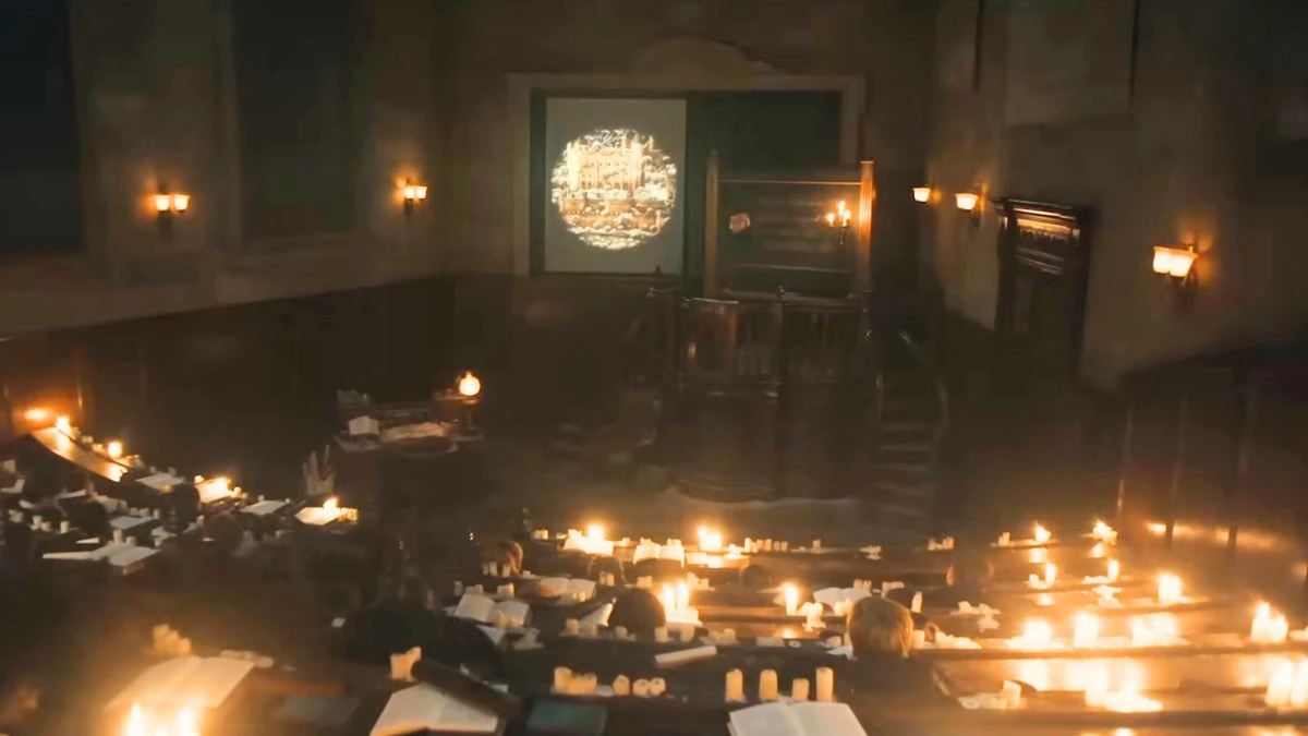 Widzowie mieli okazję zobaczyć również inne zajęcia, podczas których uczniowie robili notatki w sali wykładowej przy blasku świec. Na pierwszy rzut oka nie ma w tym nic zastanawiającego, ale po chwili można zorientować się, że lekcji nie prowadzi żaden nauczyciel - mównica jest pusta. Po bliższym przyjrzeniu się można jednak dostrzec, że na tle tablicy znajduje się lewitująca w powietrzu głowa. W związku z tym, że w książkach mowa była o profesorze Binnsie, nauczycielu historii magii, który pewnego dnia zmarł we śnie, ale wrócił jako duch, być może to właśnie on wykłada na tych zajęciach.