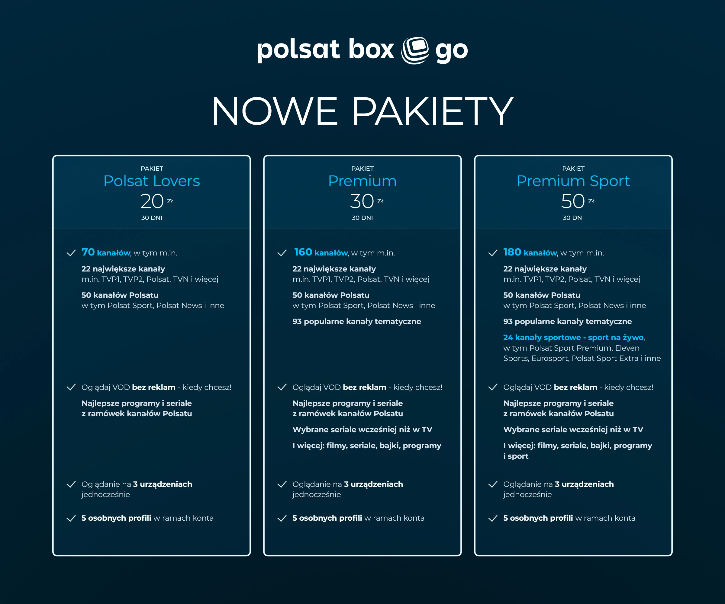 - 50 kanałów Polsatu, w tym Polsat Sport, Polsat News i inne.